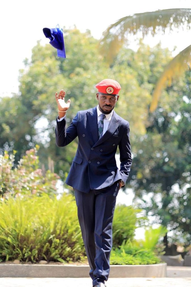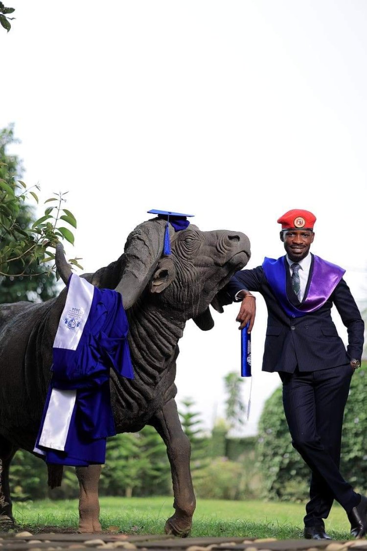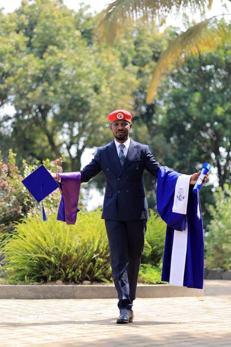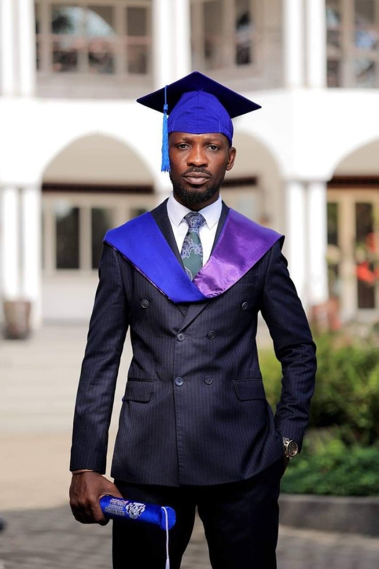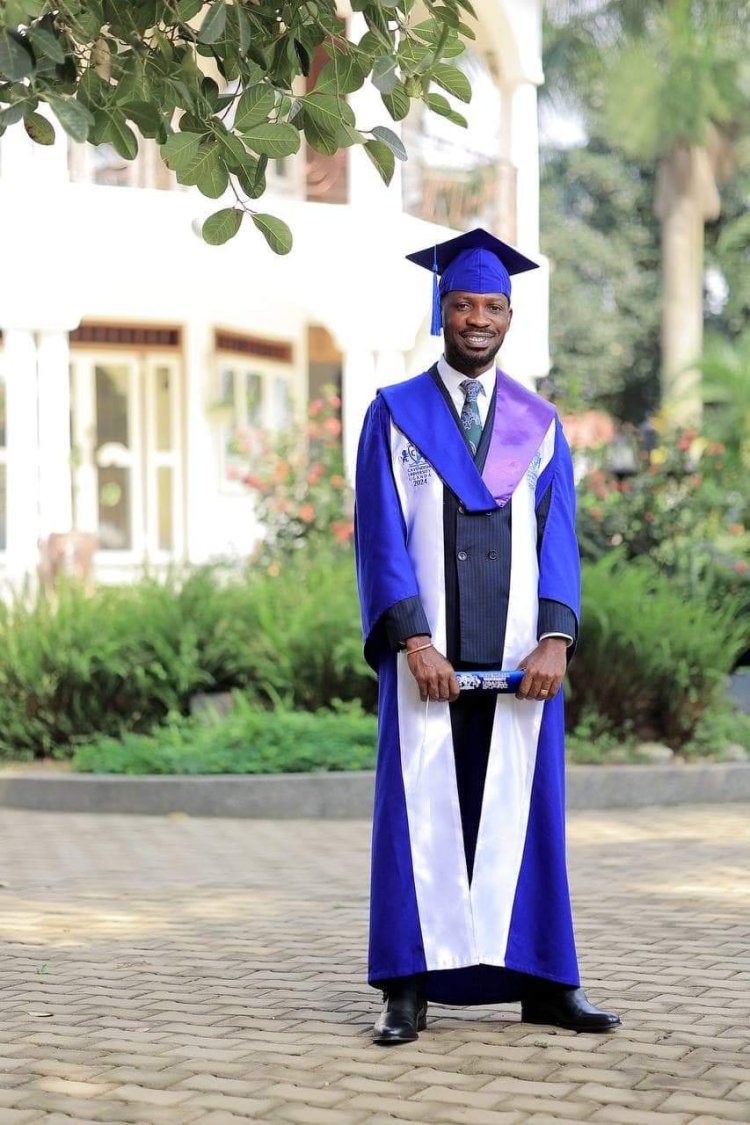 Robert Kyagulanyi uzwi mu muziki wa Uganda nka Bobi Wine akaba n'Umunyapolitike utavuga rumwe n'ubutegetsi bwa Uganda, akanyamuneza ni kose nyuma yo kubona impamyabumenyi y'icyiciro cya kabiri cya Kaminuza mu mategeko.