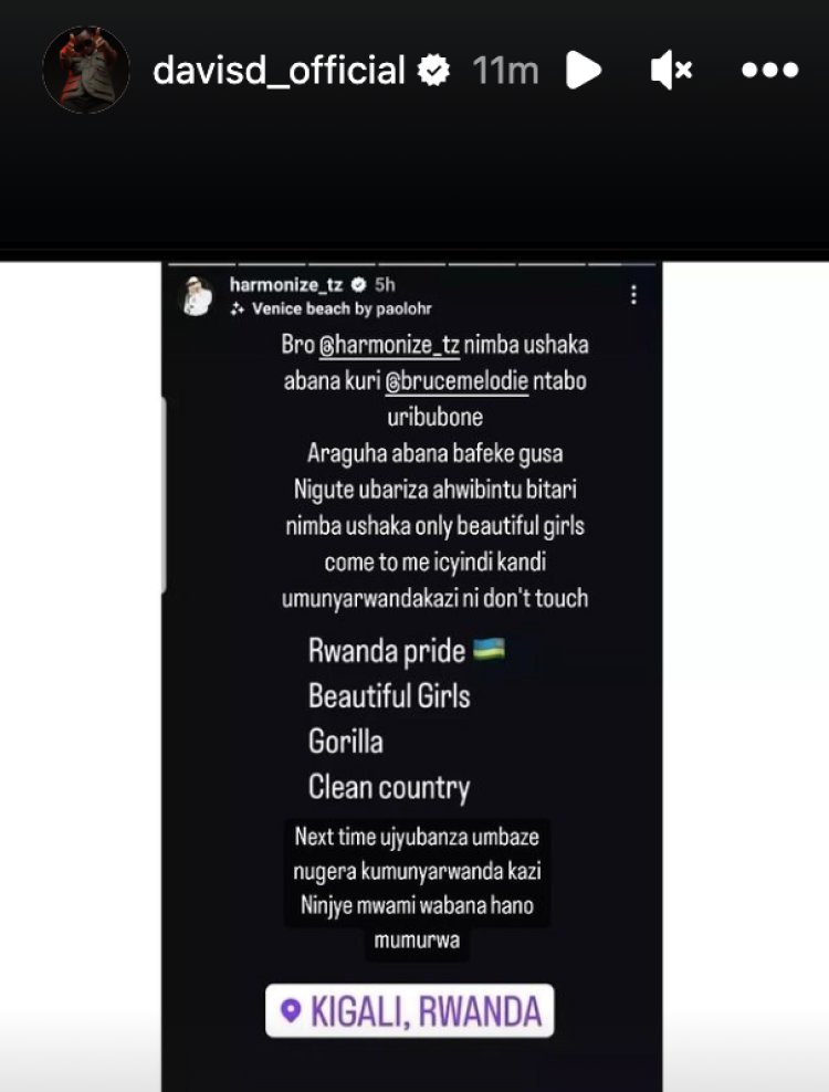 Umuhanzi w'icyamamare muri Tanzania ndetse no muri Africa y'uburasirazuba Harmonize nyuma y'uko ageze mu Rwanda, Davis D uzwiho gukunda abana (abakobwa) yahise amugenera ubutumwa ko yayobye kuba yaje gushakira abana kuri Bruce Melodie.