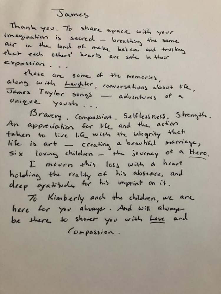 Yagize ati: “James, warakoze, gusangira umwanya n’imitekerereze yawe byari iby’agaciro. Guhumeka umwuka umwe mu isi twamaranye kandi nizera ko imitima yacu ikiri kumwe. ibyo ni bimwe mu byo nibuka, hamwe n’ibitwenge n’ibiganiro by’ubuzima byawe byiza."