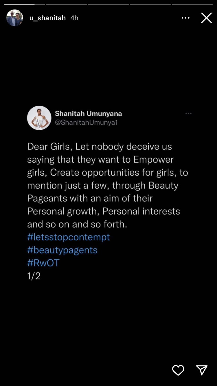 Mu butumwa yanyujije ku mbuga nkoranyambaga ze yagize ati “Bakobwa, ntihazagire umuntu ukubwira ngo agiye kukuzamura, ngo yazanye amahirwe ku bakobwa binyuze mu marushanwa y’ubwiza”.