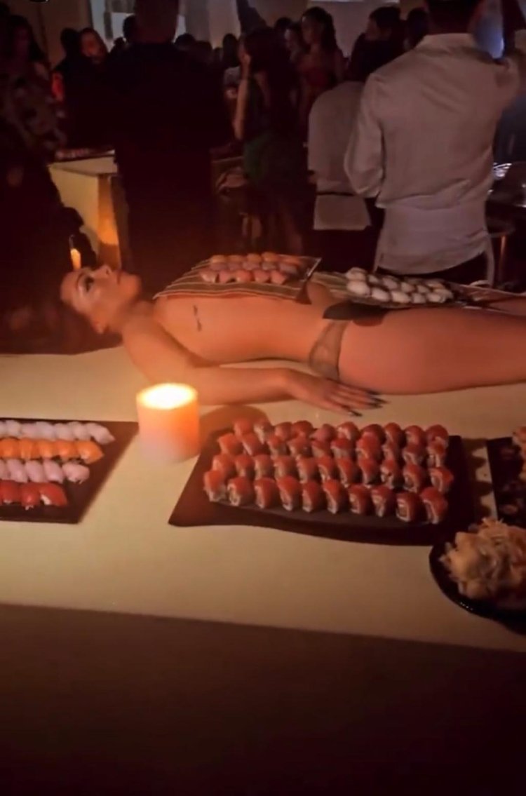 Nkuko bigaragazwa n’amashusho y’ibirori yagaragaye ku rubuga rwa interineti, abagore batandukanye bagaragara baryamye ku meza hamwe n’ibice magana bya sushi bitondekanye ahantu hose harimo no ku mibiri yabo.