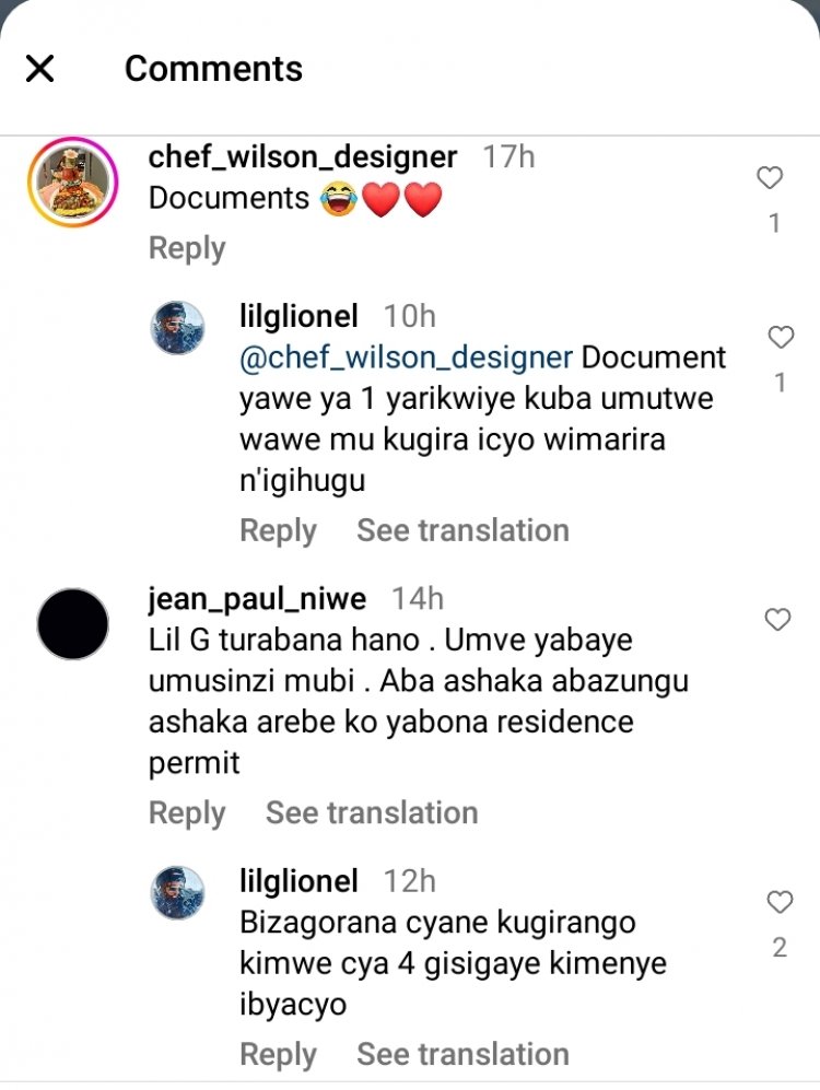 Lil G asubiza uwavuze ko icyo ashaka kuri uwo mukobwa ari ibyangombwa yagize ati "Urupapuro (document) rwawe rwa mbere rwagakwiye kuba umutwe wawe mu kugira icyo wimarira n'igihugu."