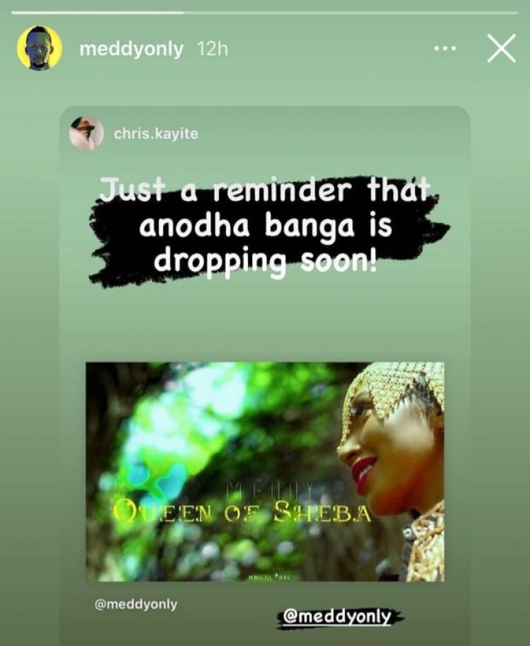 Nyuma yuko indirimbo my Vow yujuje Miliyoni 5 z’abayirebye ku rubuga rwa Youtube , Abinyujije ku rukuta rwe rwa Instagram Meddy yijeje abakunzi be ko agiye kubaha iyo ndirimbo nshya Queen of Sheba itegerejwe na benshi. Muri iki gitondo nanone abinyujije ku rukuta rwe rwa Instagram (story) Meddy yibukije abakunzi be kutarambwirwa kuko indirimbo igiye gusohoka , aho yagize ati “Uru ni urwibutso rw’uko hari indirimbo nshya ngiye gusohora”.