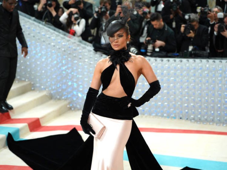 Jennifer Lopez yageze muri Met Gala 2023 yambaye ikanzu itangaje y'umukara wijimye n'iroza.