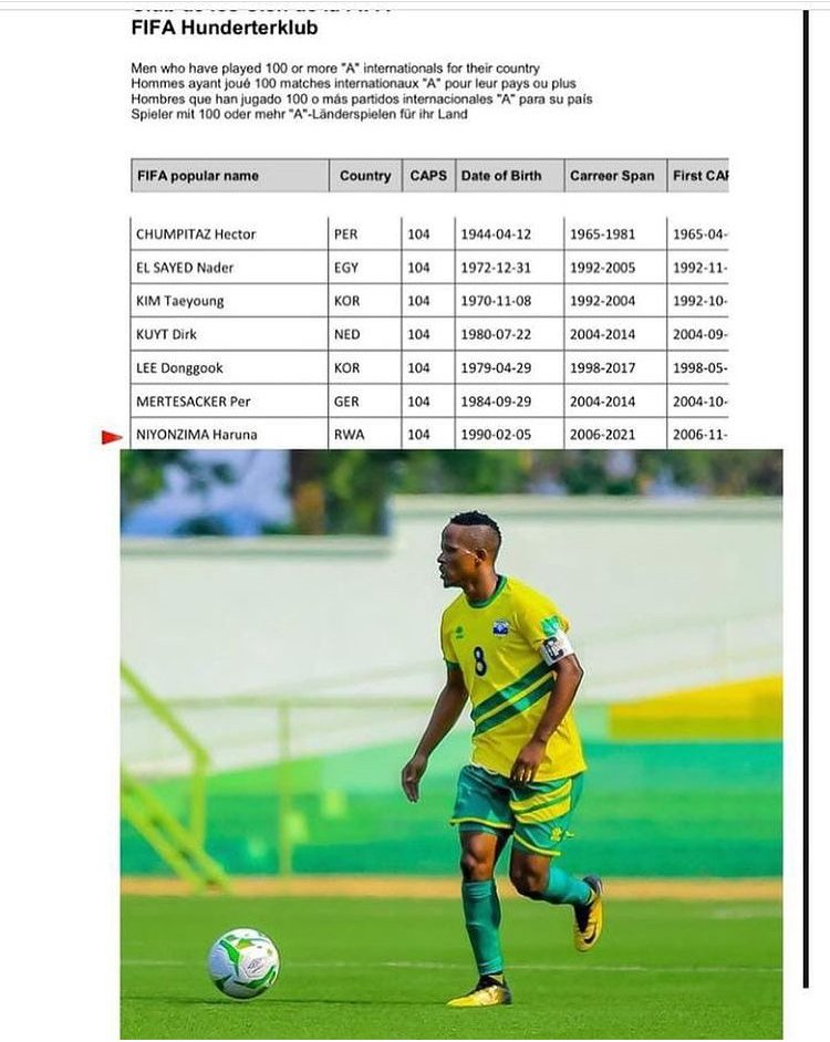 Umukinnyi w’umunyarwanda Haruna Niyonzima usanzwe ukinira ikipe y’igihugu y’uRwanda Amavubi yagaragaye ku rutonde rw'abakinnyi 10 bamaze gukina imikino irenga ijana mu makipe y’ibihugu byabo muri Africa.