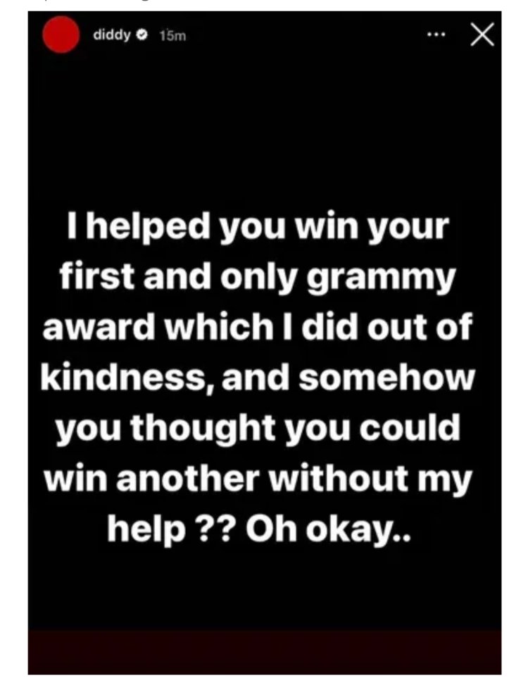 Nyuma y'amasaha make cyane, hagaragaye ubutumwa bwanditsee na P Diddy yibasira Burna Boy ko Grammy awards afite ari imwe kandi ko adateze kuzatwara indi dore ko iyo ya mbere yayitwaye kubera ubugwaneza bwa P Diddy.
