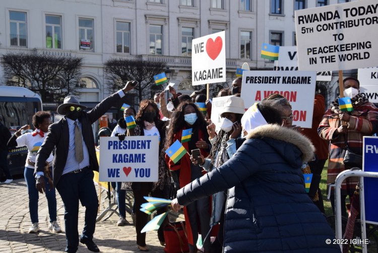 Ku manywa yo kuri uyu wa Kane, hanze y’ahakorera EU, Abanyarwanda benshi bari gucinya akadiho mu kugaragaza ishema betewe na Perezida Kagame. Bitwaje ibyapa biriho ubutumwa bwo kwishimira iterambere u Rwanda rugezeho.