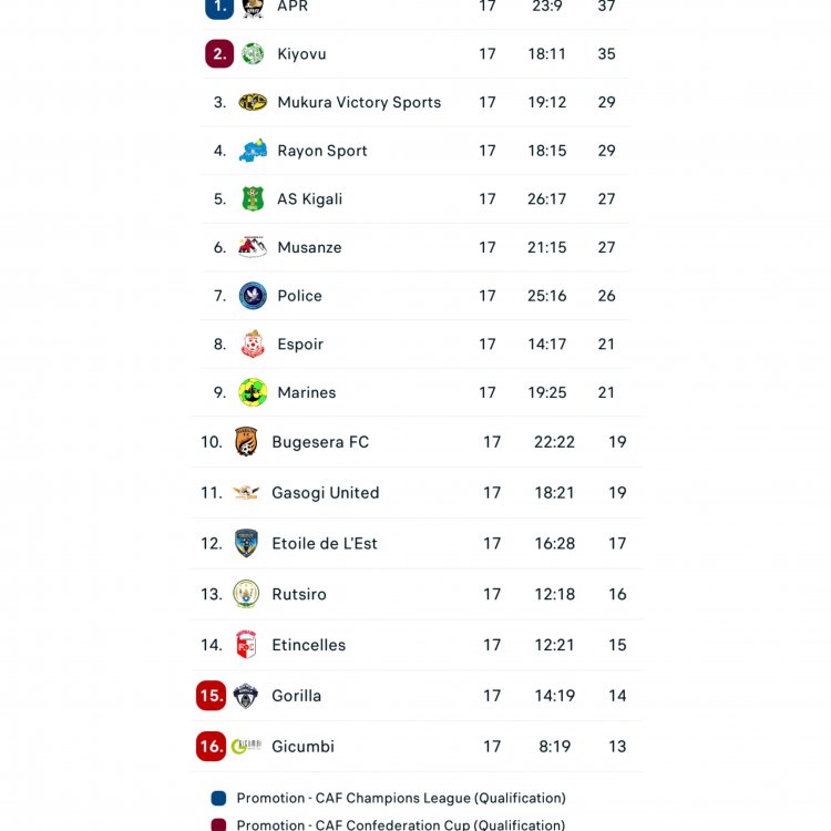 Uko urutonde rwa shampiyona ruhagaze nyuma y'umunsi wa 17 wa shampiyona