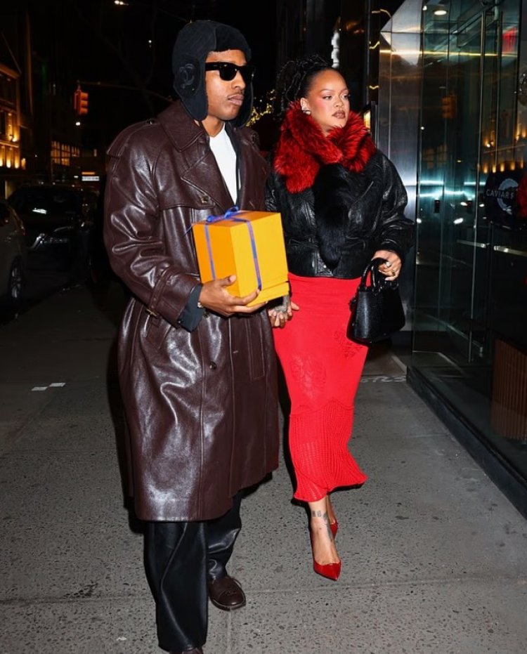 Rihanna w’imyaka 37 yari yambaye ikanzu ndende itukura iherekejwe n’inkweto ndende, ayiherekesha ikoti ry’uruhu ry’umukara. Ku ruhande rwa A$AP Rocky, we yari yambaye ikote rirerire ry’uruhu risa n’umukara, ipantaro y’umukara n’agapira k’umweru, yambaye n’ingofero ya Chanel .