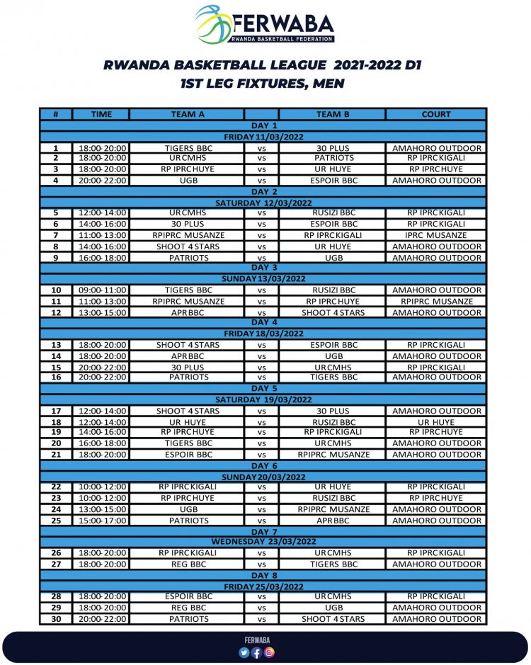 Shampiyona mu bagabo iratangira kuri uyu wa gatanu tariki ya 11 Werurwe 2022, mu gihe abakobwa nabo imikino yaba iratangira kuri uyu wa gatandatu tariki ya 12 Werurwe 2022.