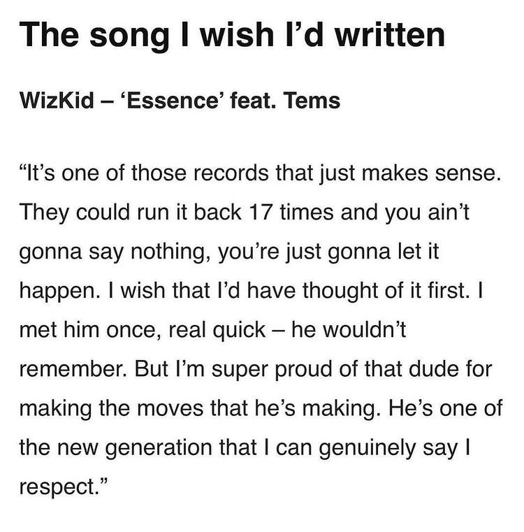 Akomeza ati “Ni indirimbo zumvikana , wayisubizamo inshuro 17 ntugire icyo urenzaho, urabireka bikaba rwose.Nakifuje kuba narayigizeho igitekerezo bwa mbere. Nahuye nawe (Wizkid) rimwe twihuta , dtacyeka atanyibuka . Ariko uriya musore ndamwishimira uburyo arimo gutera imbere.”