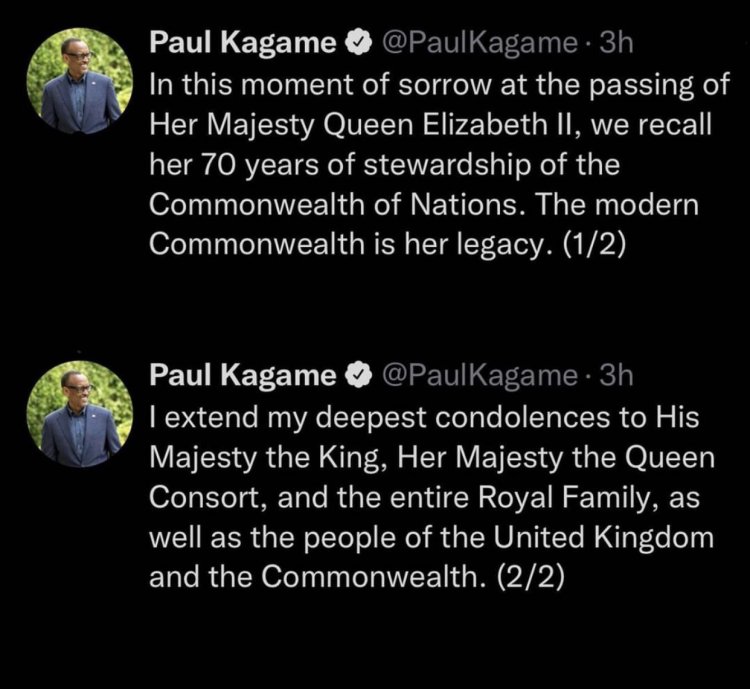 Mu butumwa yanyujije ku mbuga nkoranyambaga, umukuru w’igihugu Paul Kagame yagize ati “'Muri ibi bihe by’akababaro kubera itanga ry’Umwamikazi Elisabeth II, turazirikana imyaka 70 yari amaze ku buyobozi bw’umuryango w’ibihugu bigize Commonwealth. Commonwealth igezweho, ni umurage we.''