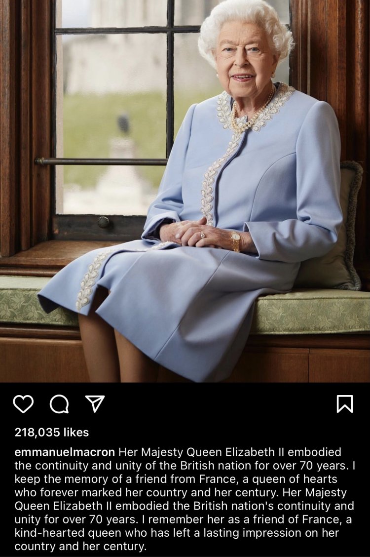 Emmanuel Macron yagize ati “Nyiricyubahiro Umwamikazi Elizabeth wa II yashushanyaga igihugu cy’Ubwongereza gukomera n’ubumwe mu myaka irenga 70. Ndamwibuka nk'inshuti y'Ubufaransa, umwamikazi w'umutima mwiza wasize igihugu cye ndetse n'ikinyejana cye.