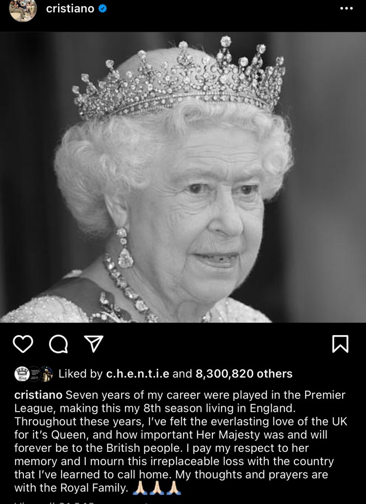 Ronaldo kandi yubaha Umwamikazi ku mirimo yakoreye Abongereza ndetse yifatanyije nabo mu kunamira Umwamikazi watanze.