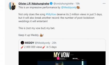 Bwana Olivier Nduhungirehe ahagarariye u Rwanda mu bihugu birimo Netherlands, Estonia, Latvia, na Lithuania. Yanditse ati:’’My vow yujuje miliyoni ebyiri mu minsi itanu ariko izaca utundi duhigo mu minsi iri imbere kuko iri gufasha abantu bari bafite ubukwe bukaba butarabaye’’.