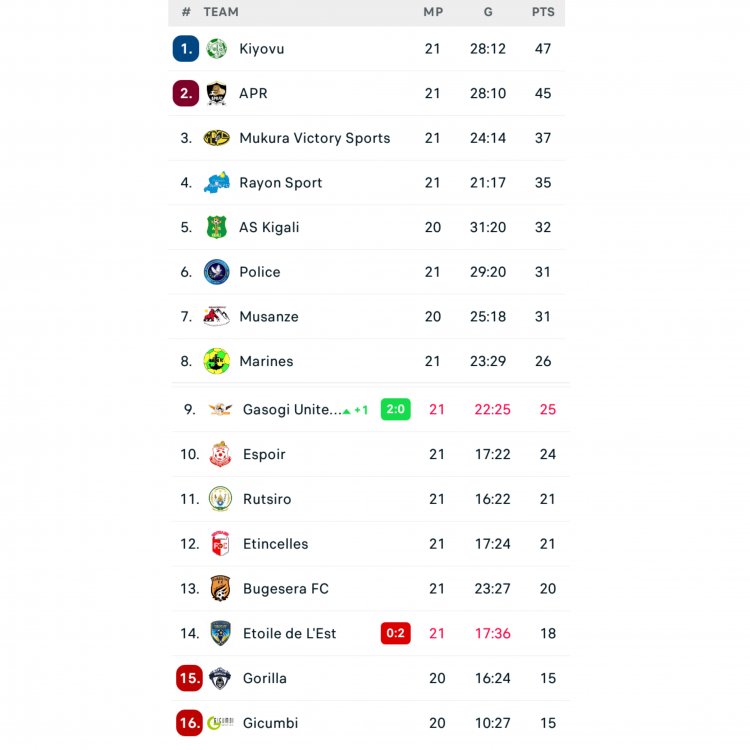 Ikipe ya Kiyovu Sports ihise ifata unwanya wa mbere aho ifite amanota 47, APR FC ifite 45 naho Mukura Victory Sports ikagira amanota 37 na Rayon Sports ifite 35.