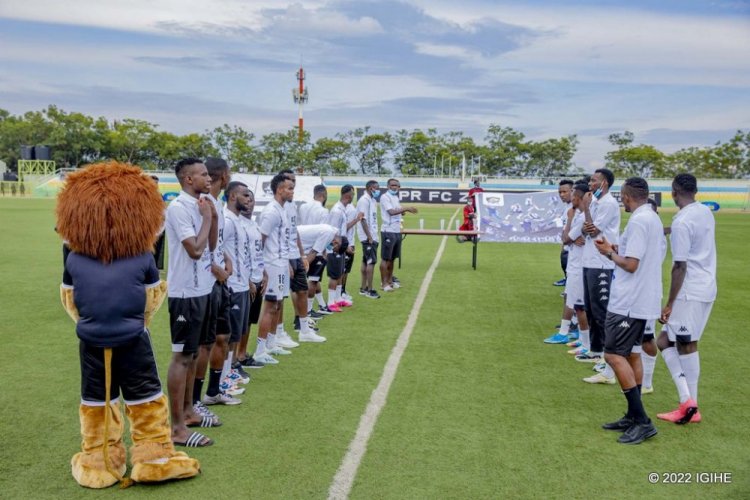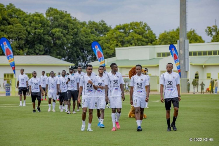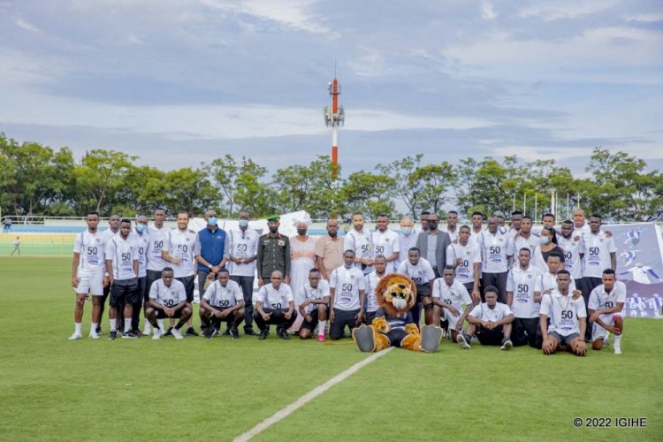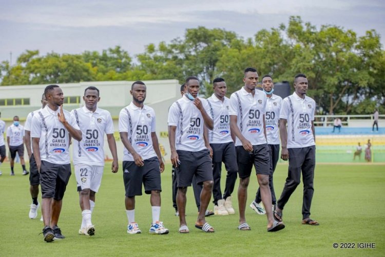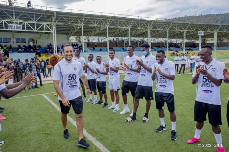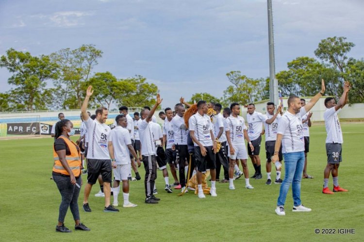 Abakinnyi bose ba APR FC n’abatoza babo bari bambaye imipira y’umweru yanditseho ko bamaze “Imikino 50 badatsindwa”.