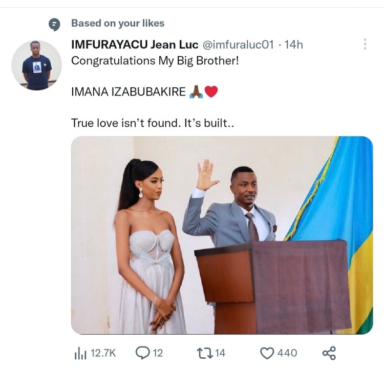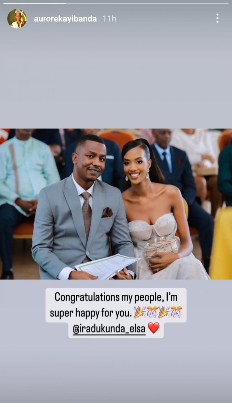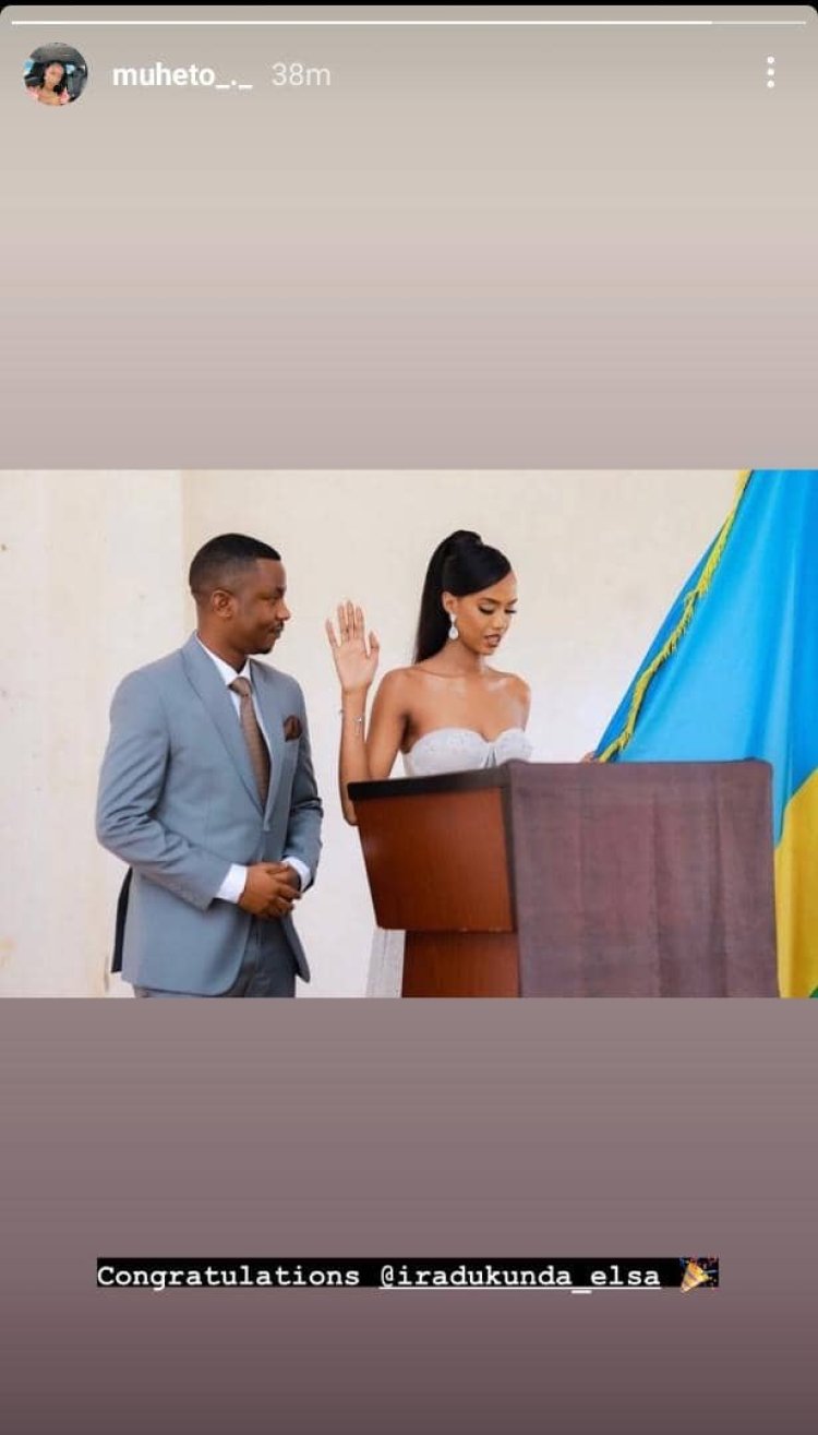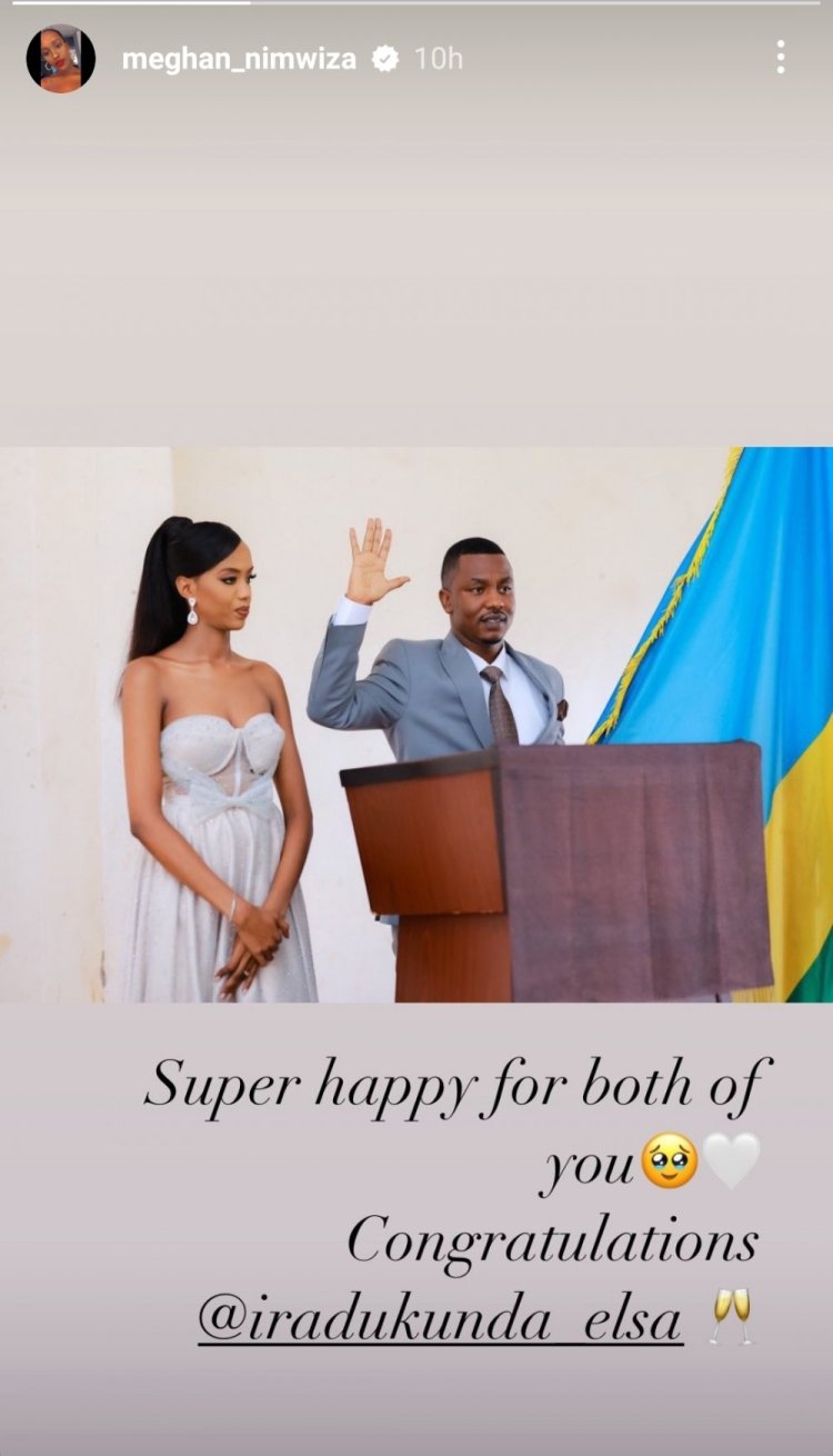 Miss Nimwiza Megan wabaye Miss Rwanda wa 2019, nawe yagaragaje ibyishimo byinshi kubwo kubona aba bombi bakoze ubukwe ati " congratulations ndishimye cyane ku bwanyu"