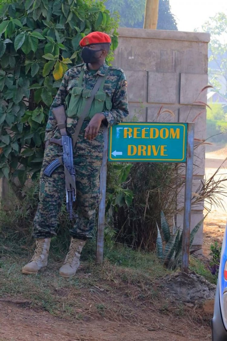 As this soldier stands on the road leading to my house to prevent me from exercising my freedom to move, I wonder what goes on in his mind. Freedom will surely come to Uganda. We shan't stop at nothing in pursuing it. pic.twitter.com/DBz0aIuayI