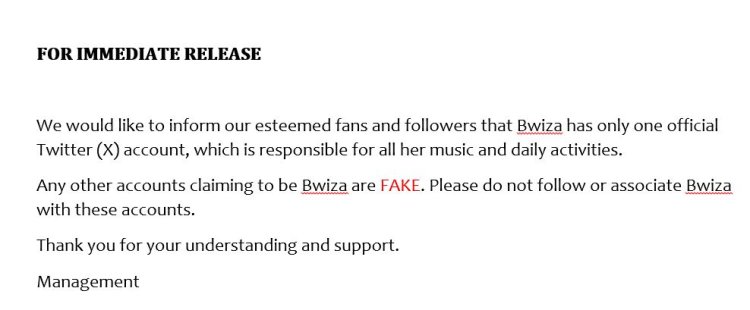 Mu itangazo Bwiza n'abamureberera inyungu bashyize hanze, batangaje ko ntaho Bwiza ahuriye na konti mpimbano zikomeje kumwiyitirira ku mbuga nkoranyambaga zibasira Butera Knowless aho bagaragaza ko amufitiye ishyari.