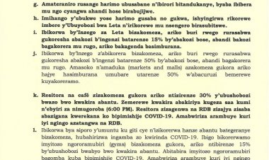Ibikorwa byose byemerewe gufunga saa kumi n’ebyiri za nimugoroba kandi izi ngamba zizatangira gushyirwa mu bikorwa guhera ku itariki 23 Kamena 2021 zongere kuvugururwa nyuma y’ibyumweru bibiri. Ingendo zihuza umujyi wa Kigali n’intara zirabujiwe ndetse izihuza uturere zirabujijiwe.