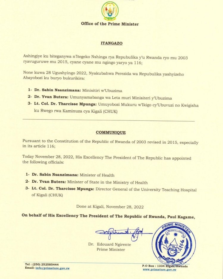 Kuri uyu wa Mbere tariki 28 Ugushyingo 2022 nk’uko byatangajwe n'Ibiro bya Minisitiri w'Intebe , Dr. Sabin Nsanzimana wari Umuyobozi Mukuru w'Ibitaro bya Kaminuza bya Butare (CHUB) ndetse yahoze ari umuyobozi w’ikigo cy’igihugu gushinzwe ubuzima RBC yagizwe minisitiri w’Ubuzima asimbuye Dr Ngamije Daniel wari umazeho imyaka isaga ibiri.