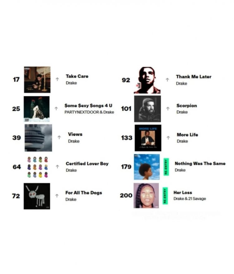 Album 10 za Drake zagaragaye kuri Billboard 200 muri iki cyumweru zirimo Take Care, Views, Certified Lover Boy, For All the Dogs, Thank Me Later, Scorpion, More Life, Her Loss, $ome $exy $ongs 4 U, ndetse na Nothing Was the Same.