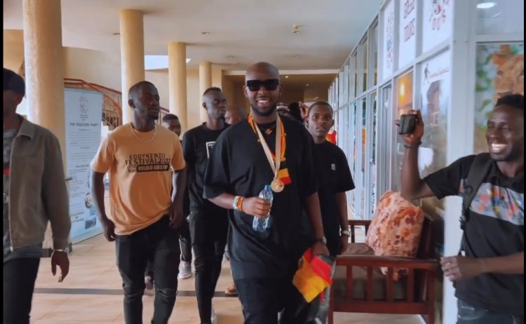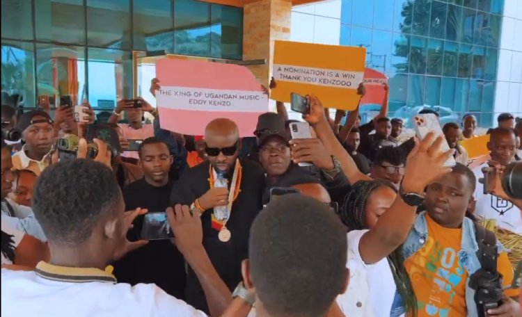 Umuhanzi Edrisah Musuuza [Eddy Kenzo] ukomoka mu gihugu cya Uganda yakiriwe n'imbaga y'abantu benshi cyane bari baje kumwakira bishimira ko yabashije kugera mu bahatanira ibihembo bya Grammy nubwo atigeze ayitwara.