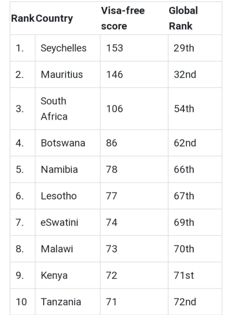 Kuri ibi byose, reka turebe urutonde rw'ibihugu bifite Pasiporo zikomeye nk'uko bigaragazwa na Henley & Partners, uretse ko uru rutonde rwa Henley & Partners rumeze neza nkurwo business insider Africa yasohoye muri Mutarama 2023, uretse impinduka nke nkaho Zambia yasimbuwe na Eswatini ndetse na Kenya yimukaho gato, naho ibindi byose birahura.