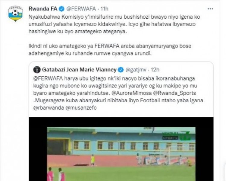 Ubutumwa bwa FERWAFA bugira buti “Nyakubahwa, Komisiyo y’imisifurire mu bushishozi bwayo niyo igena ko umusifuzi yafashe icyemezo kidakwiriye. Icyo gihe hafatwa ibyemezo hashingiwe ku byo amategeko ateganya.