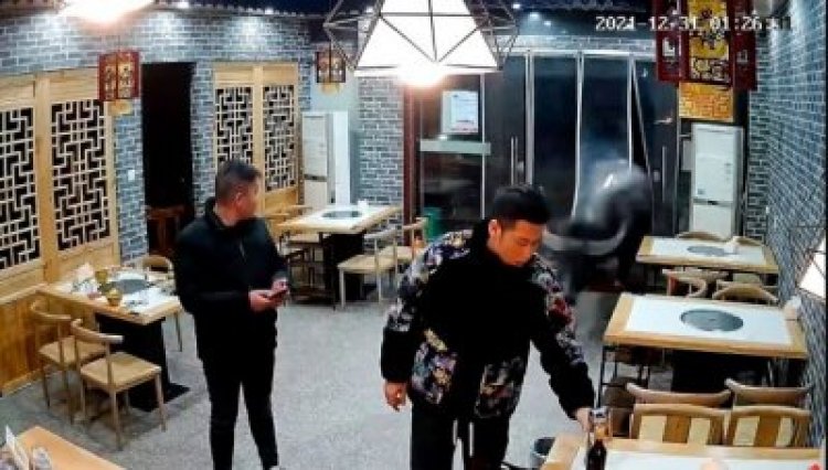 Amashusho ya CCTV yagaragaje iyi mfizi iri kwinjira muri resitora imwe yo mu mujyi wa Taizhou, mu burasirazuba bw’Ubushinwa. Hanyuma yahise isekura umuntu yagezeho bwa mbere imujugunya mu kirere.