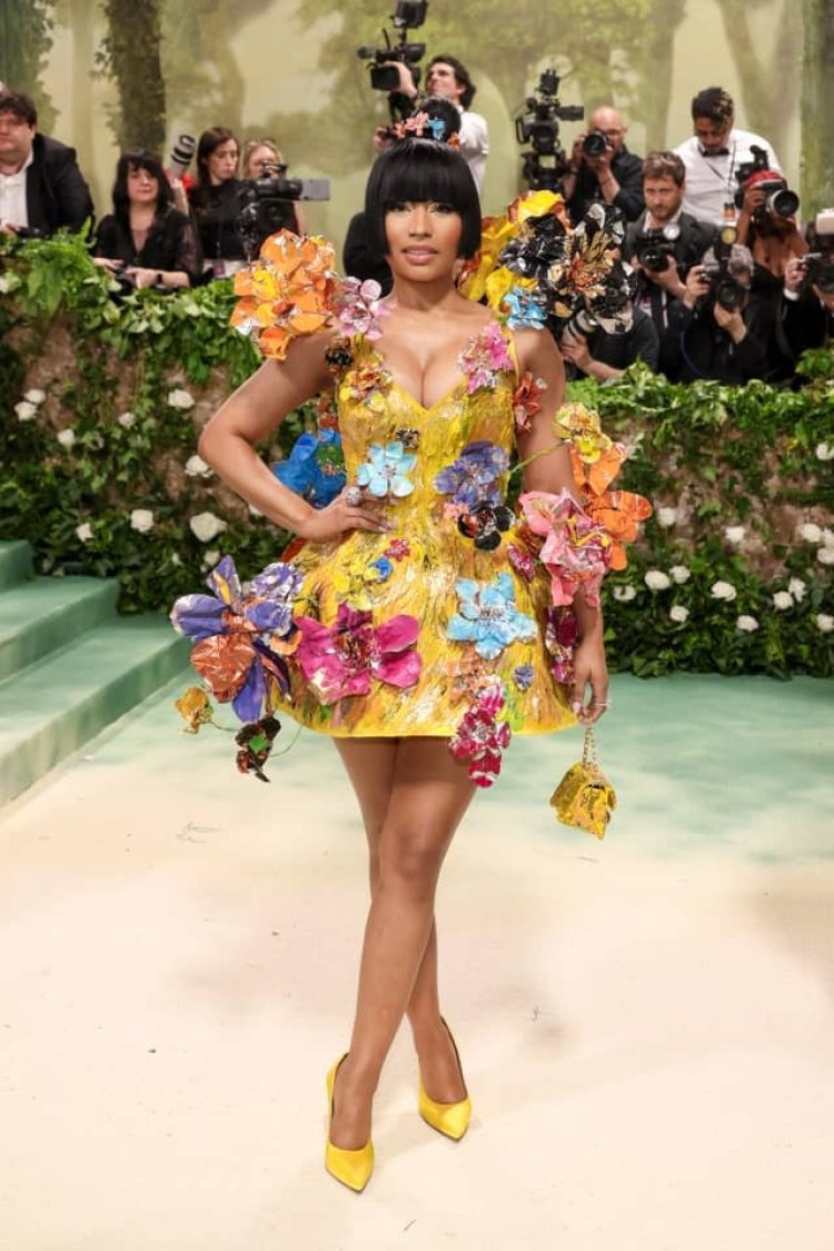 Nicki Minaj witabiriye ibi birori ku nshuro ya karindwi, akaba akunze guserukana imyanzuro itangaje, kuri iyi nshuro yaserutse mu ikanzu ngufi itatseho indabo z’amabara atandukanye, isa n’inkweto n’agasakoshi mu ntoki byose biri mu ibara rya zahabu.