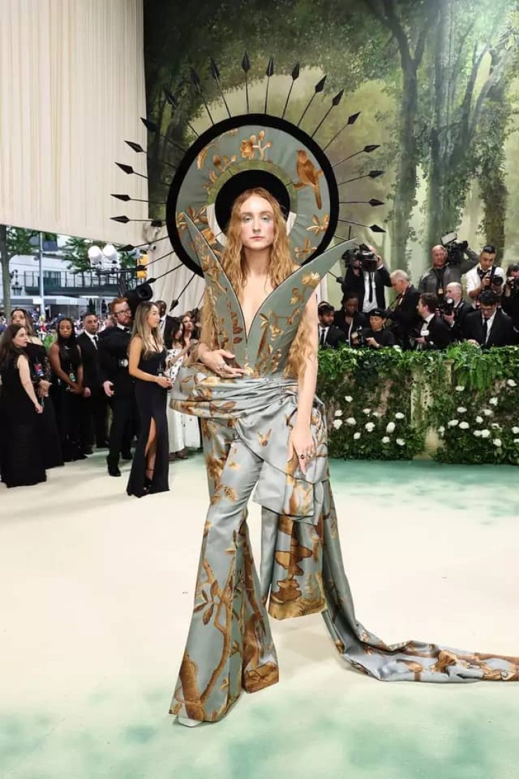 Umuhanzikazi Lana Dey Rey uzwi mu ndirimbo nka 'Young and Beautiful' yaserukanye ikanzu irimo umweru wijimye, ushushanyijeho amashami y’umukara, ndetse n’igitambaro kimutwikiriye hejuru.