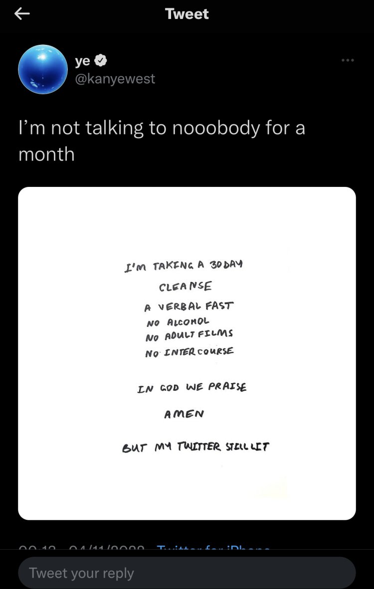 Nyuma yo kubona ntawumucira akari urutega, Ye abinyujije ku rubuga rwa Twitter yatangaje ko yafashe imyanzuro yo kutavuga n’umuntu uwo ariwe wese, kudatera akabariro, kutareba filime z’abakuze, kudafata ku gatama n’ibindi bijyanye no kwishima ahubwo akaza ahugiye mu kwitekerezaho.