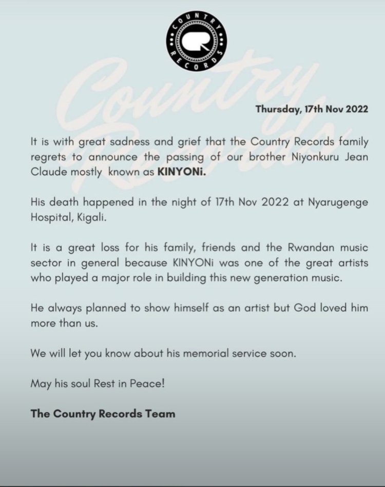 Nk’uko ibaruwa ituruka muri Country Records ibiviga, uyu musore yaguye mu bitari bya Kigali mu karere ka Nyarugenge.