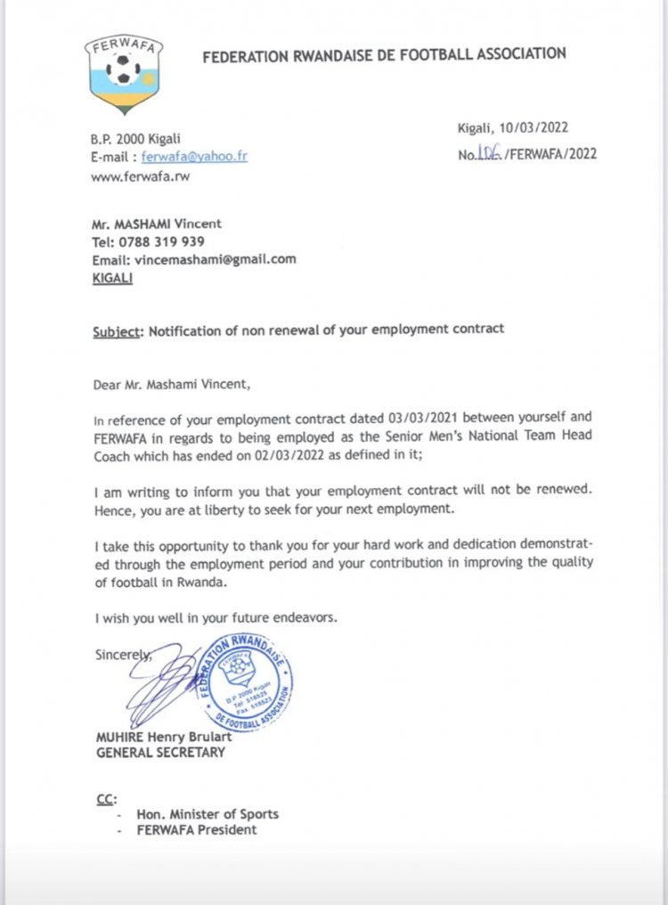 Ubu FERWAFA yamaze kwandikira ibaruwa imenyesha Mashami Vincent ko nta gahunda yo kumwongereza amasezerano ihari, kandi bamubwira ko yemerewe kuba yashaka akazi mu yindi kipe.