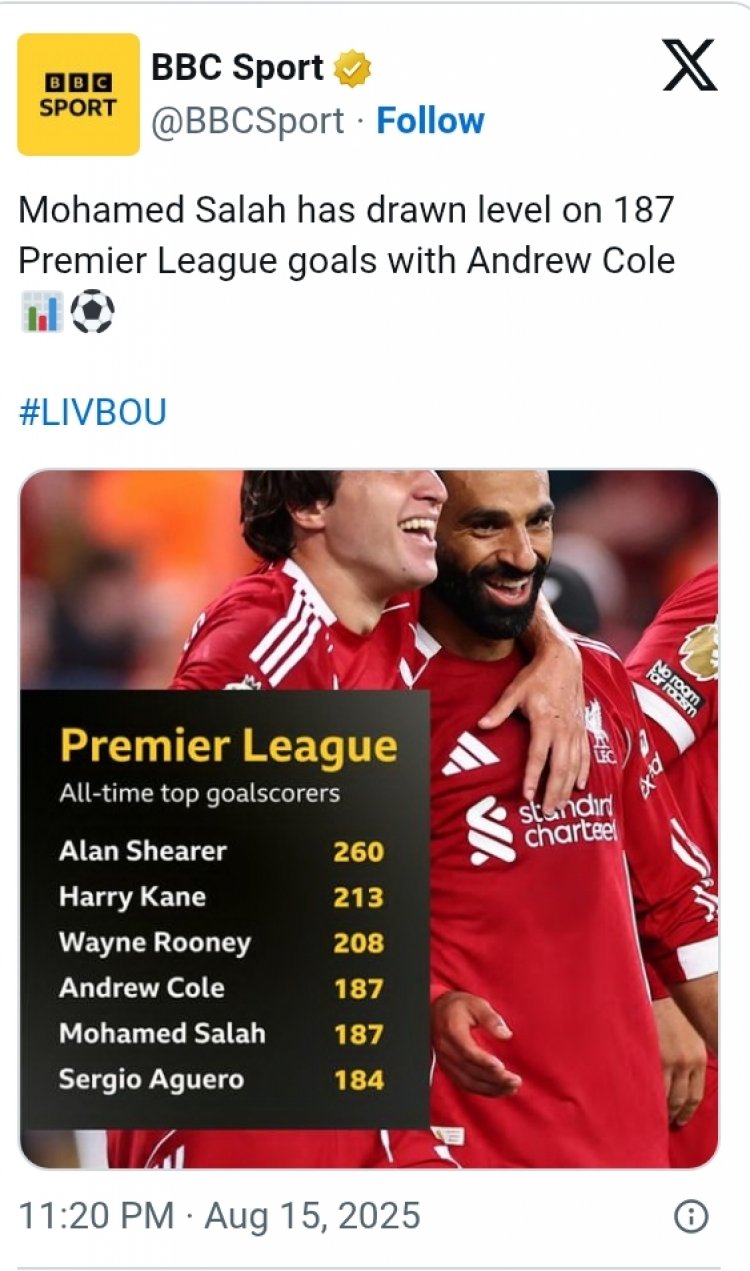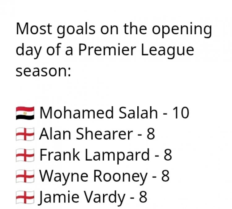 Usibye kuba yabaye uwa mbere ukoze ibi, BBC yatangaje ko Salah yahise anganya n'umunyabigwi w'ikipe ya Manchester United, Andrew Cole, umubare w'ibitego byinshi bigeze kuri 187 batsize muri iyi Shampiyona nyuma ya Alan Shearer watsinze ibitego 260, Harry Kane watsinze 253, na Wayne Rooney watsinze 208.