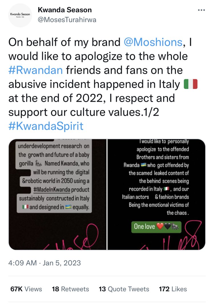 Moses Turahirwa kuri ubu uri mu Butaliani yaje gusaba imbabazi abanyarwanda ndetse n’aba Taliani bababajwe n’aya mashusho amugaragaza akorana imibonano mpuzabitsina n’abo basore babiri.