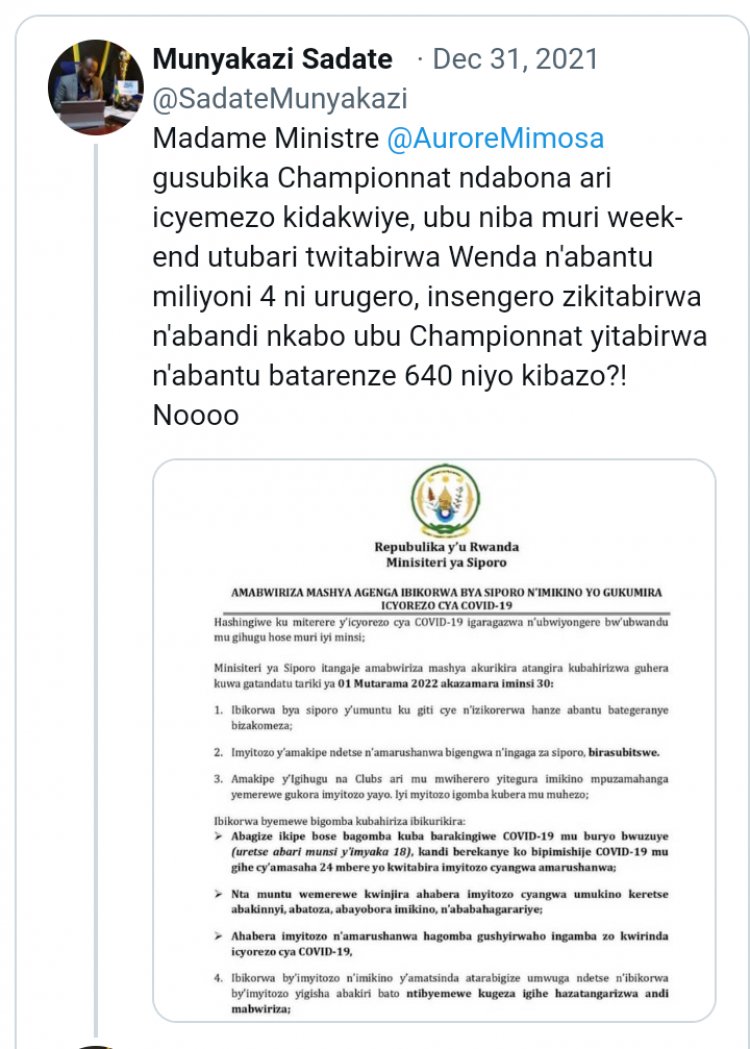 Sadate yagize ati:“Madame Minisitiri Aurore Mimosa gusubika shampiyona ndabona ari icyemezo kidakwiye, ubu niba muri week-end utubari twitabirwa wenda n’abantu miliyoni 4 ni urugero, insengero zikitabirwa n’abandi nkabo ubu shampiyona yitabirwa n’abantu batarenze 640 ni yo kibazo?