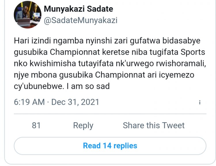 Munyakazi Sadate wahoze ari umuyobozi wa Rayon Sport dore ko adasiba gutanga ibitekerezo kuri ruhago nyarwanda, nawe yagiye ku rubuga rwe rwa twitter anenga cyane icyo kemezo cyo gusubika shampiyona.