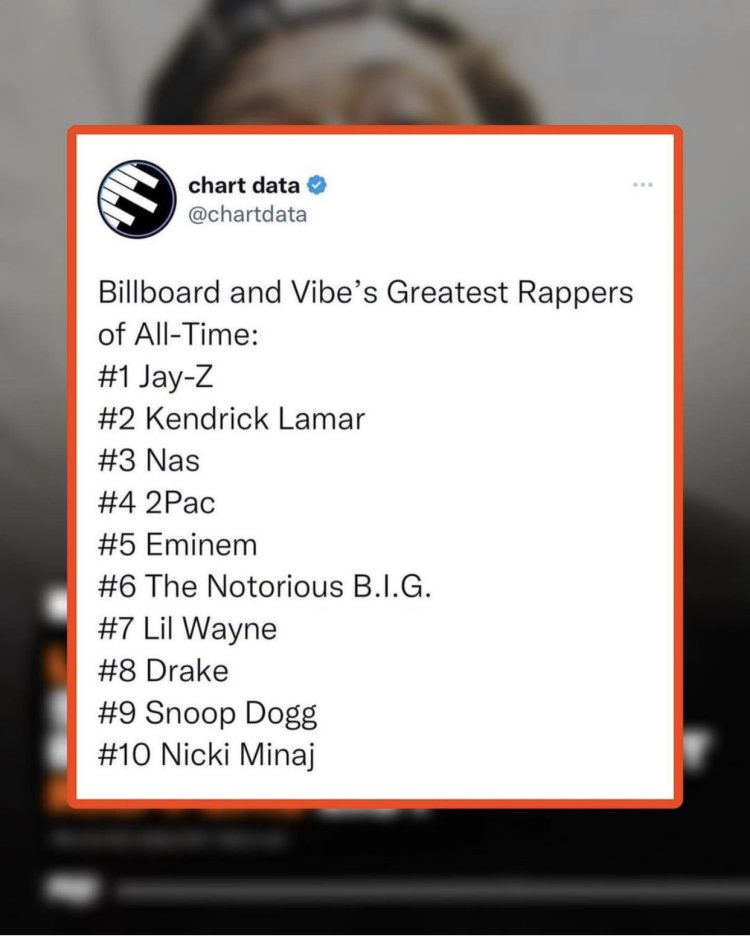Ku 09 Gashyantare 2023 nibwo ikinyamakuru Billboard/Vibe cyakoze urutonde rw’abaraperi 50 b’ibihe byose, uru rutonde ruyobowe na JAY-Z akurikiwe na Kendrick Lamar, Nas, Tupac, Eminem n’abandi.