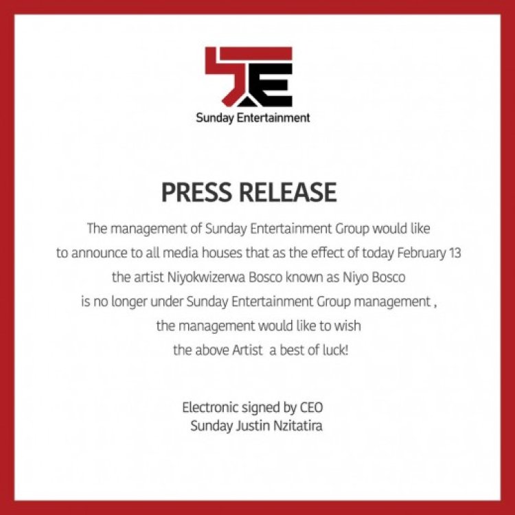 Umuhanzi Niyokwizera Bosco wamamaye nka Niyo Bosco wari umaze ukwezi n'iminsi 13 asinye muri Sunday Entertainment, bamaze gutandukana nkuko itangazo rya Sunday Entertainment ribyemeza.