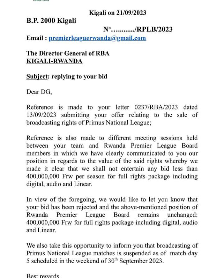 Ku gicamunsi cyo kuri uyu wa Kane nibwo ibaruwa Rwanda Premier League yanditse isubiza RBA yagiye hanze, ibamenyesha ko uburenganzira bwo kwerekana iyi shampiyona RBA itazabuhabwa munsi ya miliyoni 400 z'amayanyarwanda.