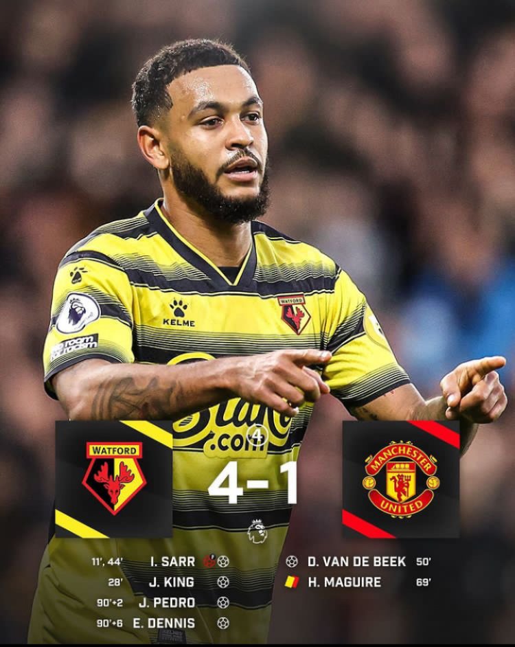 Watford yarindiriye iminota yinyongera kugira ngo Joao Pedro wari umaze kwinjira asimbuye atsinde igitego cya gatatu maze na Emmanuel Dennis ashyiremo igitego cya kane birangira ari ibitego bine bya Watford kuri kimwe cya Manchester United.