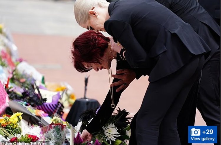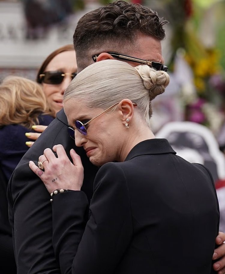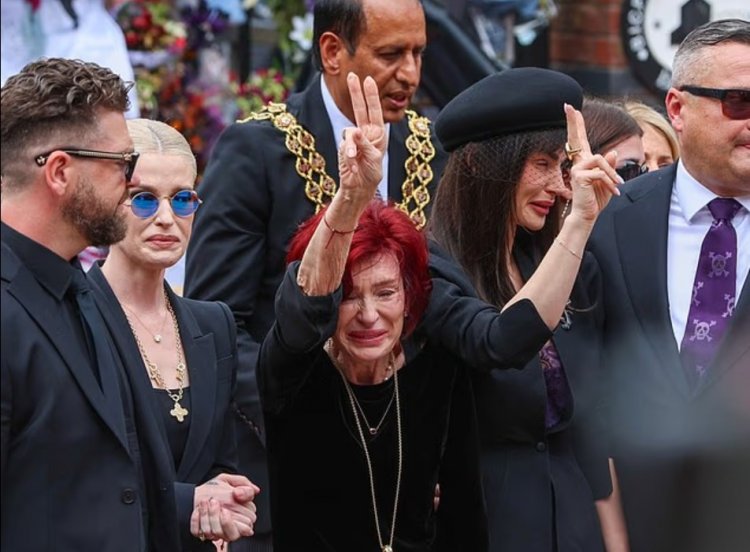Sharon w’imyaka 72 y’amavuko yashyigikiwe n’abana babo, Jack, Kelly na Aimee batwaye indabo zo gushyira ku mubiri muri uwo muhango ubwo bari bari kumwe n’undi mwana w’umuhungu, Louis, Osbourne yabyaranye n’undi mugore, Thelma Riley.