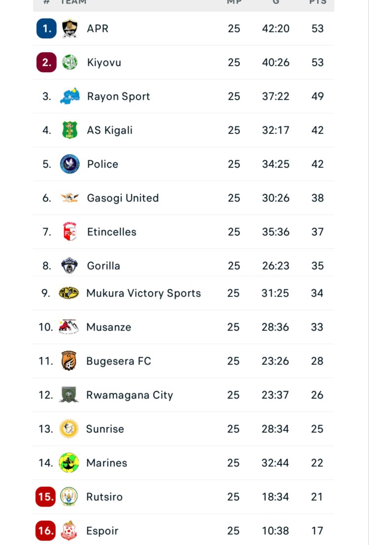 Uko urutonde rwa shampiyona ruhagaze