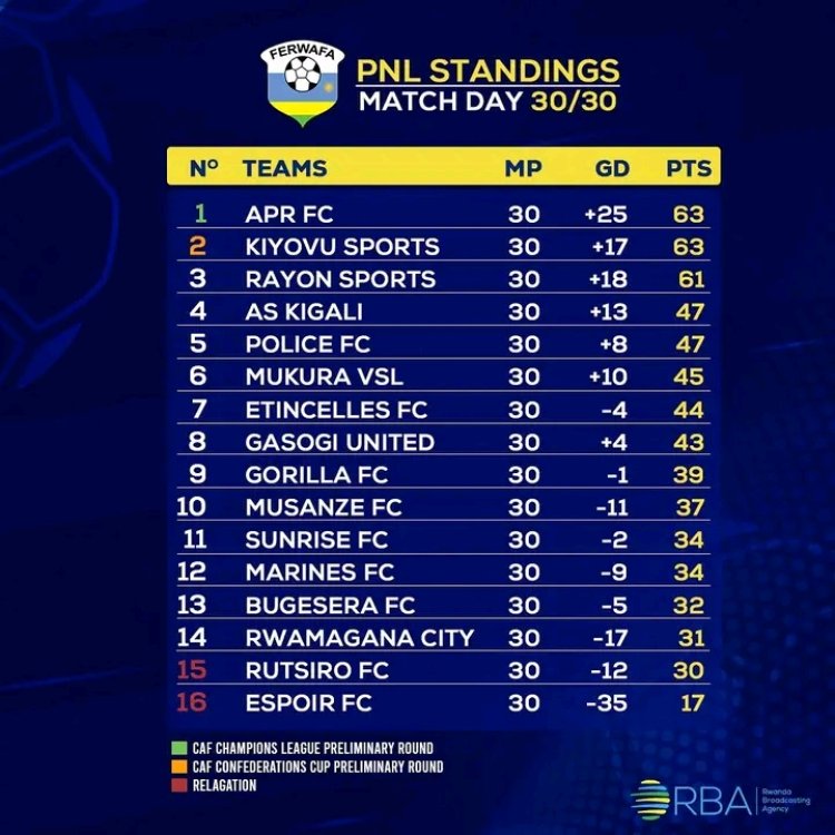 APR FC yagize amanota 63 iyanganya na Kiyovu Sports ariko APR FC yegukana igikombe kuko izigamye ibitego byinshi.