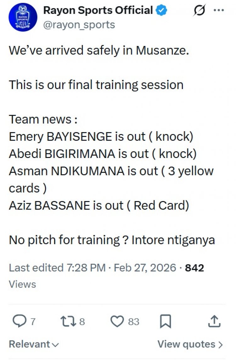 Amakuru dukesha mama urwagasabo tv avuga ko Rayon Sports yageze kuri Sitade Ubworoherane igasanga ifunze, bituma ibura aho ikorera imyitozo ya nyuma mbere y’umukino.