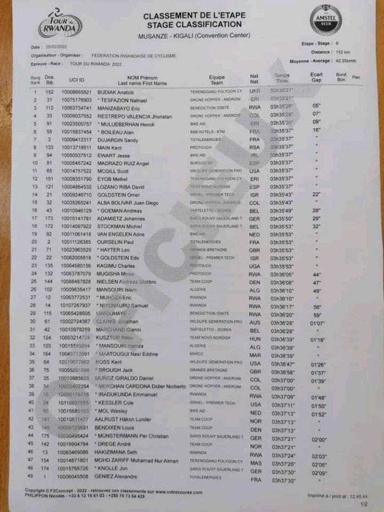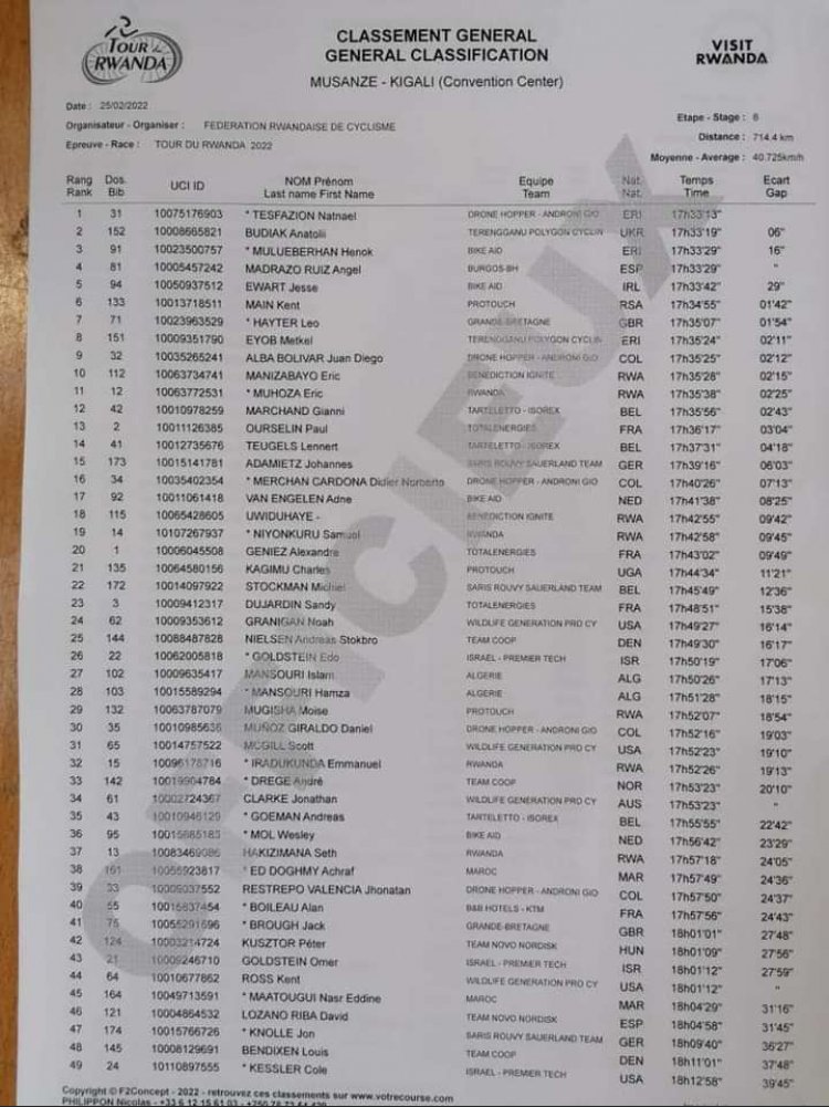 Umwenda w'umuhondo uhise ufatwa na Nathaniel Tesfazion akaba arusha Budiak Anatoli amasegonda atandatu. Umunyarwanda uza hafi ku rutonde rusange ni Imanizabayo Eric uza ku mwanya wa 10 akaba arushwa n'uwa mbere iminota 2 n'amasegonda 15.