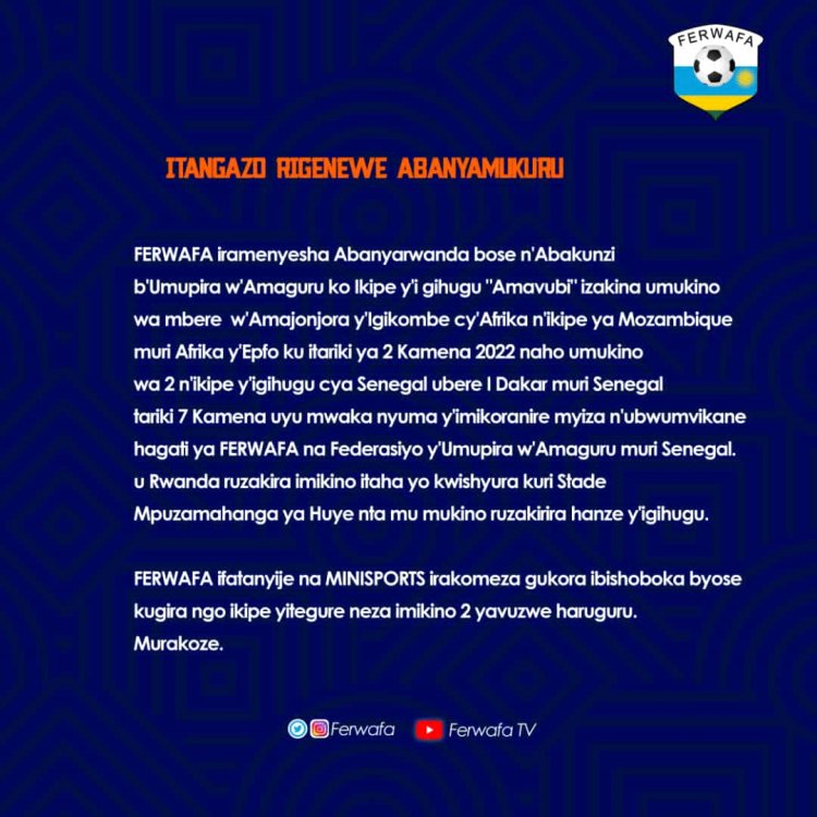 Icyabayeho ni ibiganiro hagati ya FERWAFA n'ishyirahamwe ry'umupira muri Senegal bemeza ko Senegal izakira uyu mukino, naho u Rwanda rukazakira umukino wo kwishyura uzaba muri Nzeri.